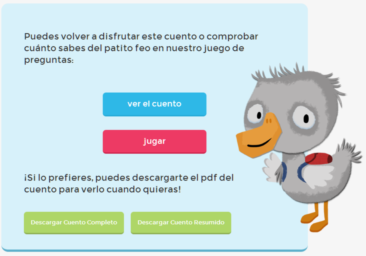 "Al igual que en anteriores pictocuentos dispone de la posibilidad de descarga de la historia en versión PDF imprimible y la inclusión en el final de la historia, de una actividad complementaria con preguntas variadas tipo quiz acerca del cuento".