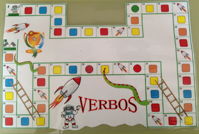 Conjunto de barajas más tablero para reforzar el uso correcto de los tiempos verbales. Estos materiales permiten llevar a cabo actividades lúdicas, en grupo o de forma individual, que facilitan la adquisición de aprendizajes planificados desde el Área de Lengua o enfocados a la estructura del lenguaje (morfosintaxis)